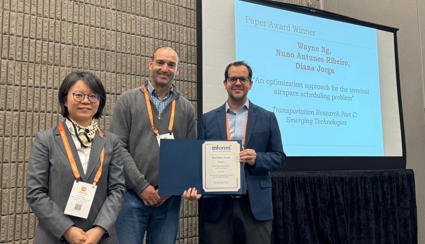 Assistant Prof Nuno Ribeiro (right) receiving the Best Paper Award on behalf of the team from Prof Li Lishuai (President of the Air Transportation Section of INFORMS, Professor at City University of Hong Kong) and Assoc Prof Felipe Delgado (Chair of the Best Paper Award, Associate Professor at Pontificia Universidad Catolica de Chile).