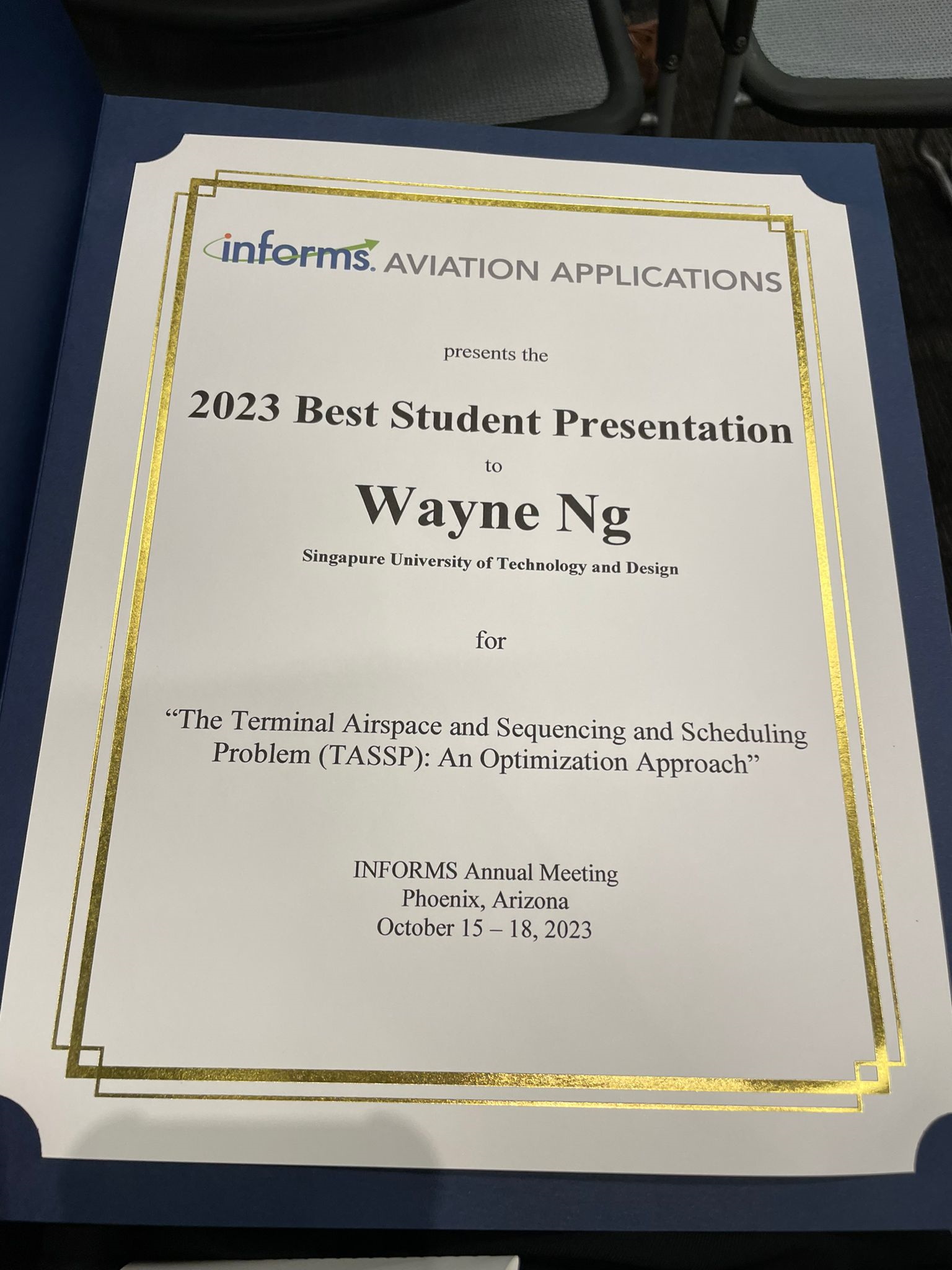 Wayne Ng has been recognised with the Best Student Presentation Award at the 2023 INFORMS Annual Meeting in Phoenix. Wayne presented his PhD research, which focuses on the development of optimisation algorithms for aircraft sequencing and scheduling in congested terminal airspace regions. This work was conducted under the supervision of Asst Prof Nuno Ribeiro and is a part of the ongoing “Resilient Airspace Operations” project for CAAS.