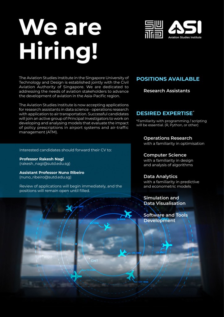 The Aviation Studies Institute is now accepting applications for research assistants in data science – operations research with application to air transportation. The successful candidate will join an active group of Principal Investigators to work on developing and analysing models that evaluate the impact of policy prescriptions in airport systems and air-traffic management (ATM).
