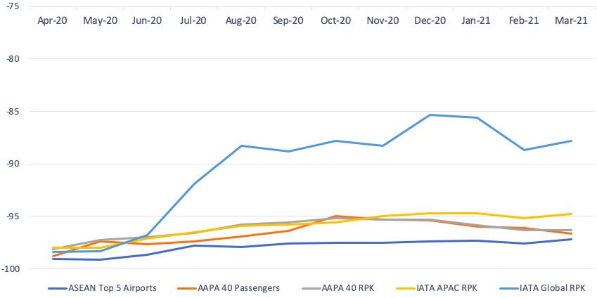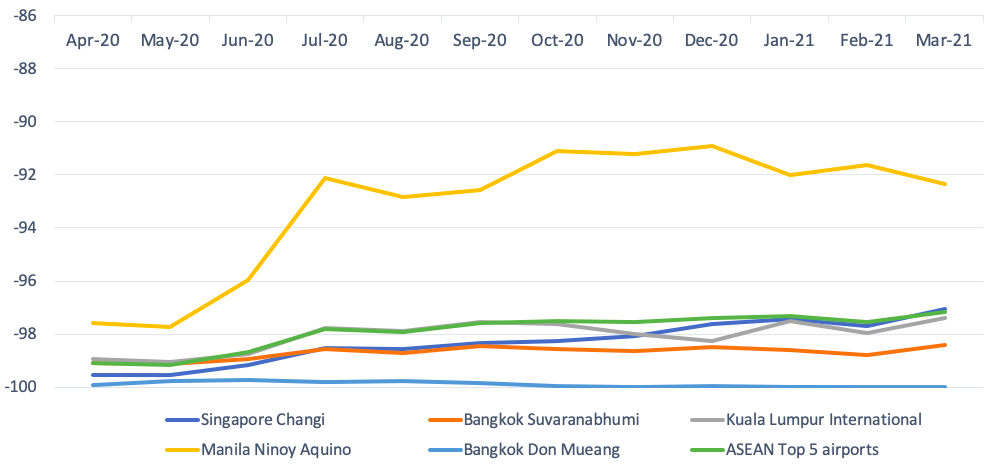 Figure 1 tracks monthly international passenger traffic change at each of the top five airports and all five airports combined. The rate of decline has been relatively flat for several months. With all ASEAN countries keeping their borders closed, a significant improvement in international traffic is simply unachievable.