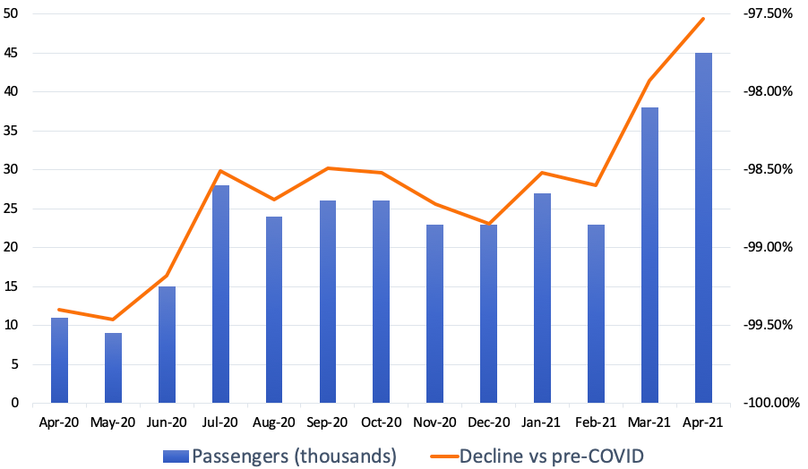 International passenger traffic at the top five airports combined was down about 99% in the first three months of the crisis (April to June 2020). Every month since July 2020, the decline for the top five airports combined has been between 97% and 98%. The lowest rate of decline was achieved in March 2021, when traffic dropped 97.2% compared to pre-COVID levels (March 2019). However, this represented only a very slight improvement compared to the prior months.