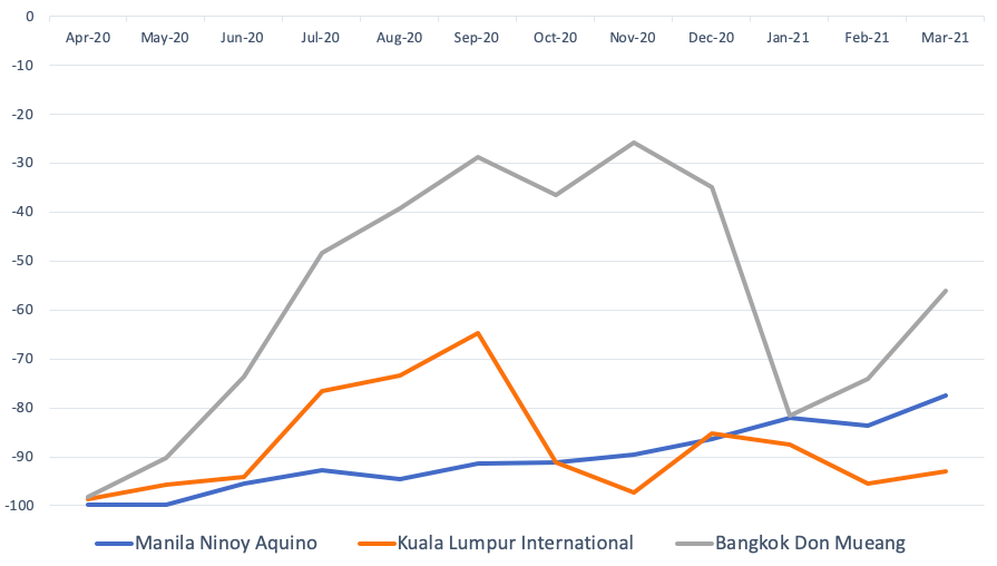 Figure 4. (new figure for this update). Monthly domestic passenger traffic change (%) compared to pre-COVID for Manila Ninoy Aquino, Kuala Lumpur International and Bangkok Don Mueang