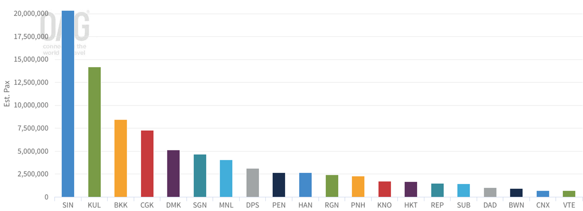 Singapore Changi (SIN) is the largest airport based on O&D passengers within ASEAN followed by Kuala Lumpur International, Bangkok Suvarnabhumi (BKK), Jakarta Soekarno-Hatta (CKG) and Bangkok Don Mueang (DMK). Ho Chi Minh (SGN), Manila (MNL), Bali (DPS), Penang (PEN) and Hanoi (HAN) round out the top 10 while Yangon (RGN), and Phnom Penh (PNH), Medan (KNO), Phuket (HKT), Siem Reap (REP), Surabaya (SUB), Da Nang (DAD), Bandar Seri Begawan (BWN), Chiang Mai (CNX) and Vientiane (VTE) make the top 20.