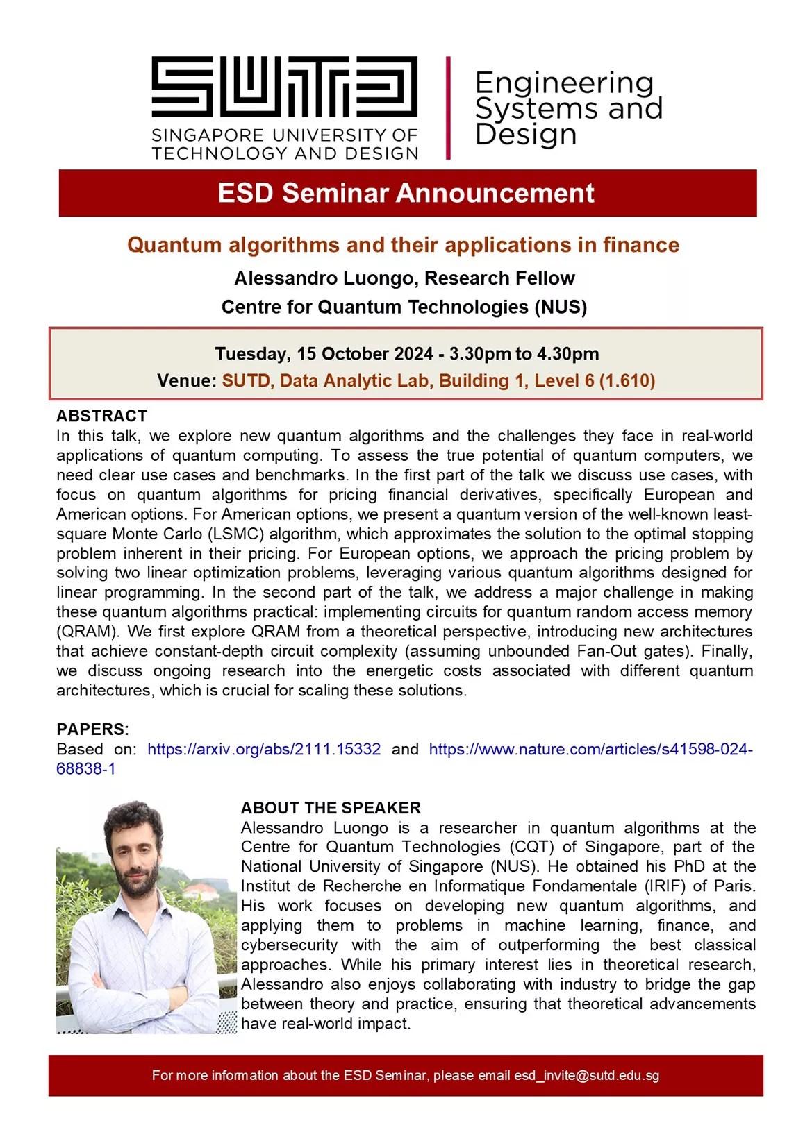 Alessandro Luongo is a researcher in quantum algorithms at the Centre for Quantum Technologies (CQT) of Singapore, part of the National University of Singapore (NUS). He obtained his PhD at the Institut de Recherche en Informatique Fondamentale (IRIF) of Paris. His work focuses on developing new quantum algorithms, and applying them to problems in machine learning, finance, and cybersecurity with the aim of outperforming the best classical approaches. While his primary interest lies in theoretical research, Alessandro also enjoys collaborating with industry to bridge the gap between theory and practice, ensuring that theoretical advancements have real-world impact.