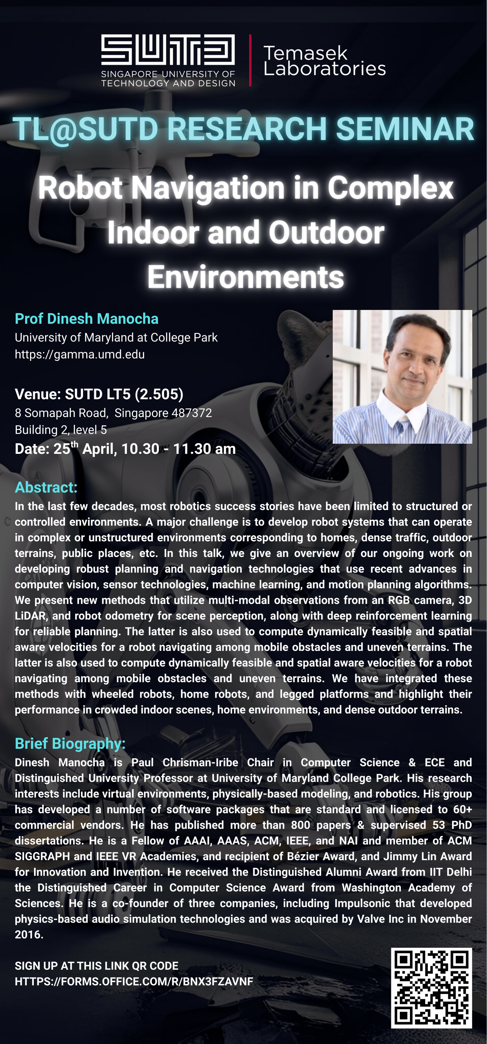 We are excited to invite you to the upcoming TL@SUTD Research Seminar titled “Robot Navigation in Complex Indoor and Outdoor Environments.” This seminar will be presented by Prof. Dinesh Manocha from the University of Maryland at College Park.