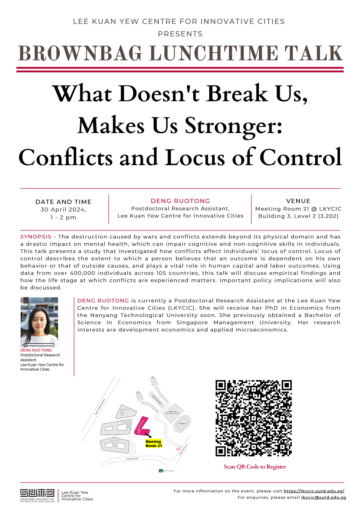 The destruction caused by wars and conflicts extends beyond its physical domain and has a drastic impact on mental health, which can impair cognitive and non-cognitive skills in individuals. This talk presents a study that investigated how conflicts affect individuals’ locus of control. Locus of control describes the extent to which a person believes that an outcome is dependent on his own behavior or that of outside causes, and plays a vital role in human capital and labor outcomes. Using data from over 400,000 individuals across 105 countries, this talk will discuss empirical findings and how the life stage at which conflicts are experienced matters. Important policy implications will also be discussed.