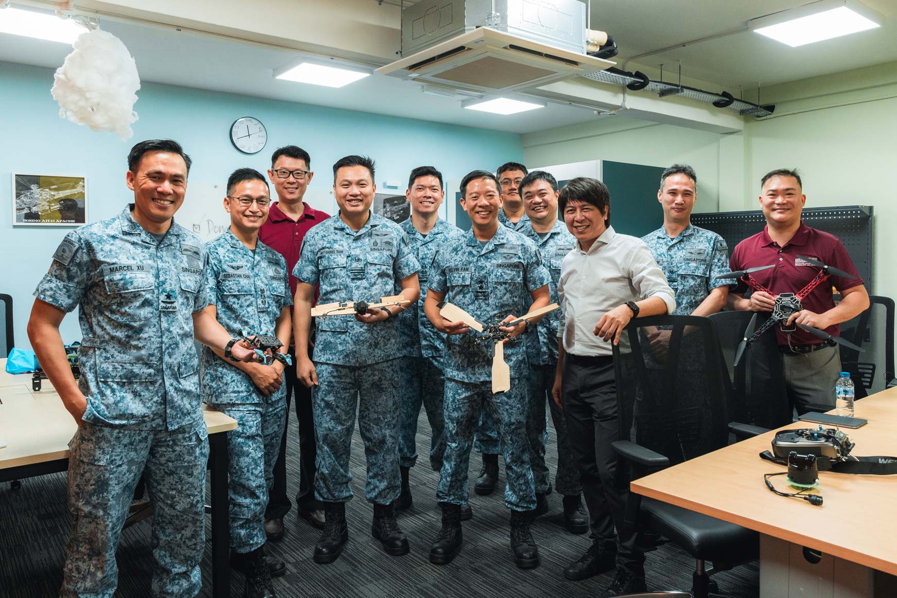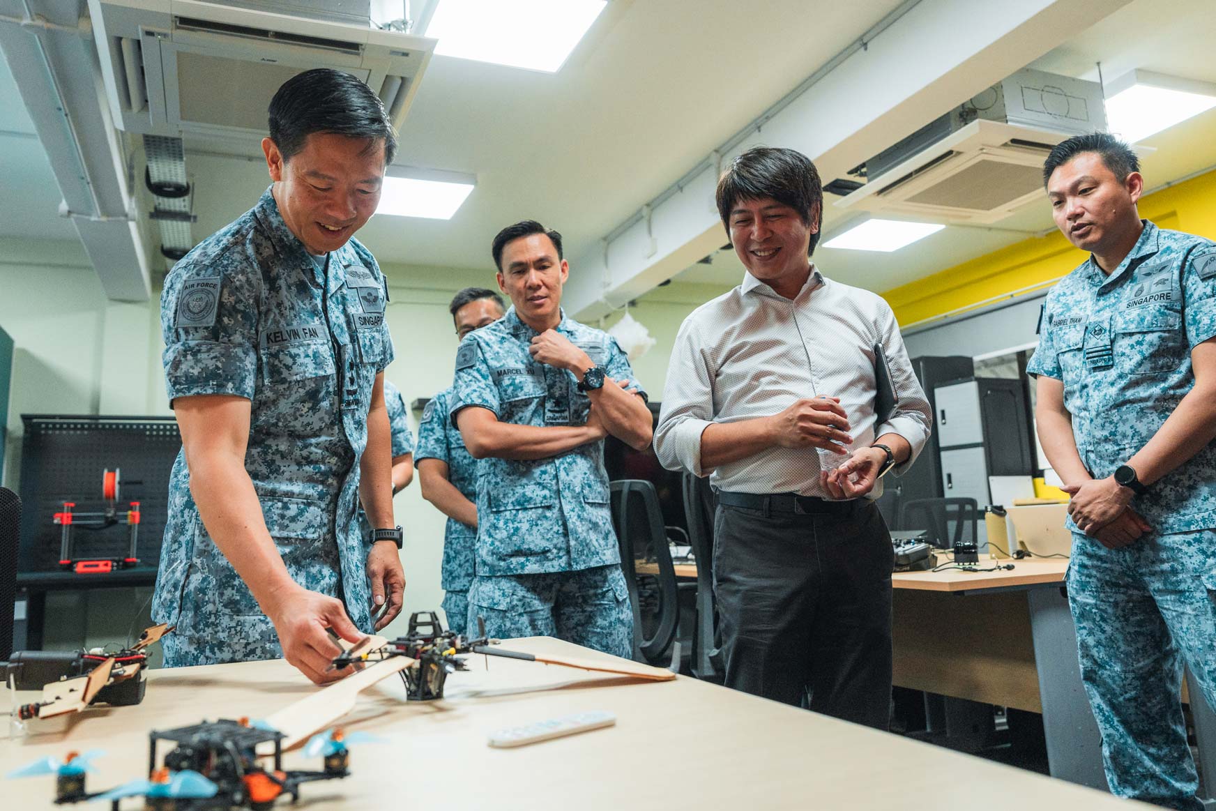 RSAF and SUTD staff in the newly opened Design·AI Fab Lab @Sembawang Airbase. The Design·AI Fab Lab represents a physical space for ideation and rapid prototyping. (Image credit: MINDEF)