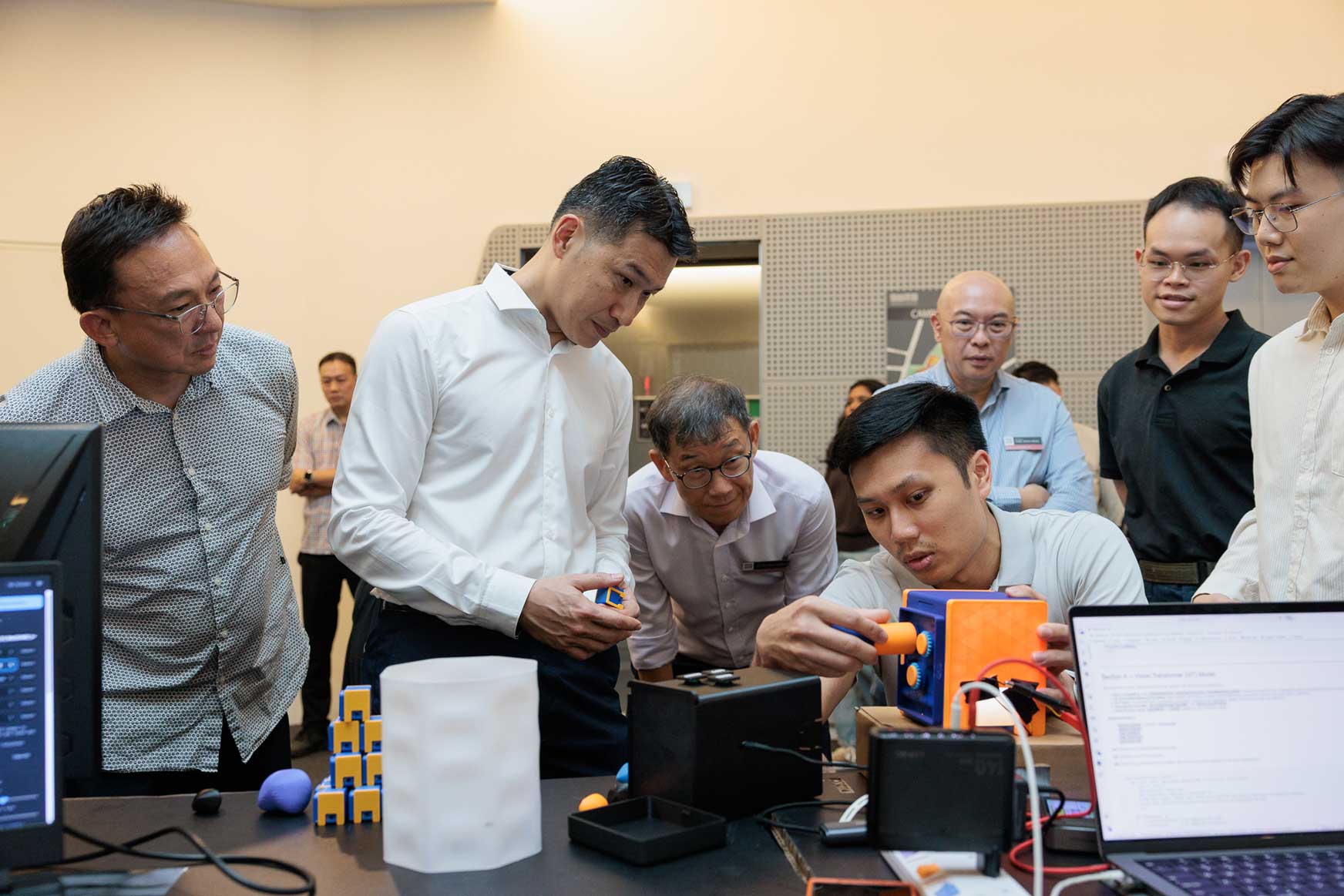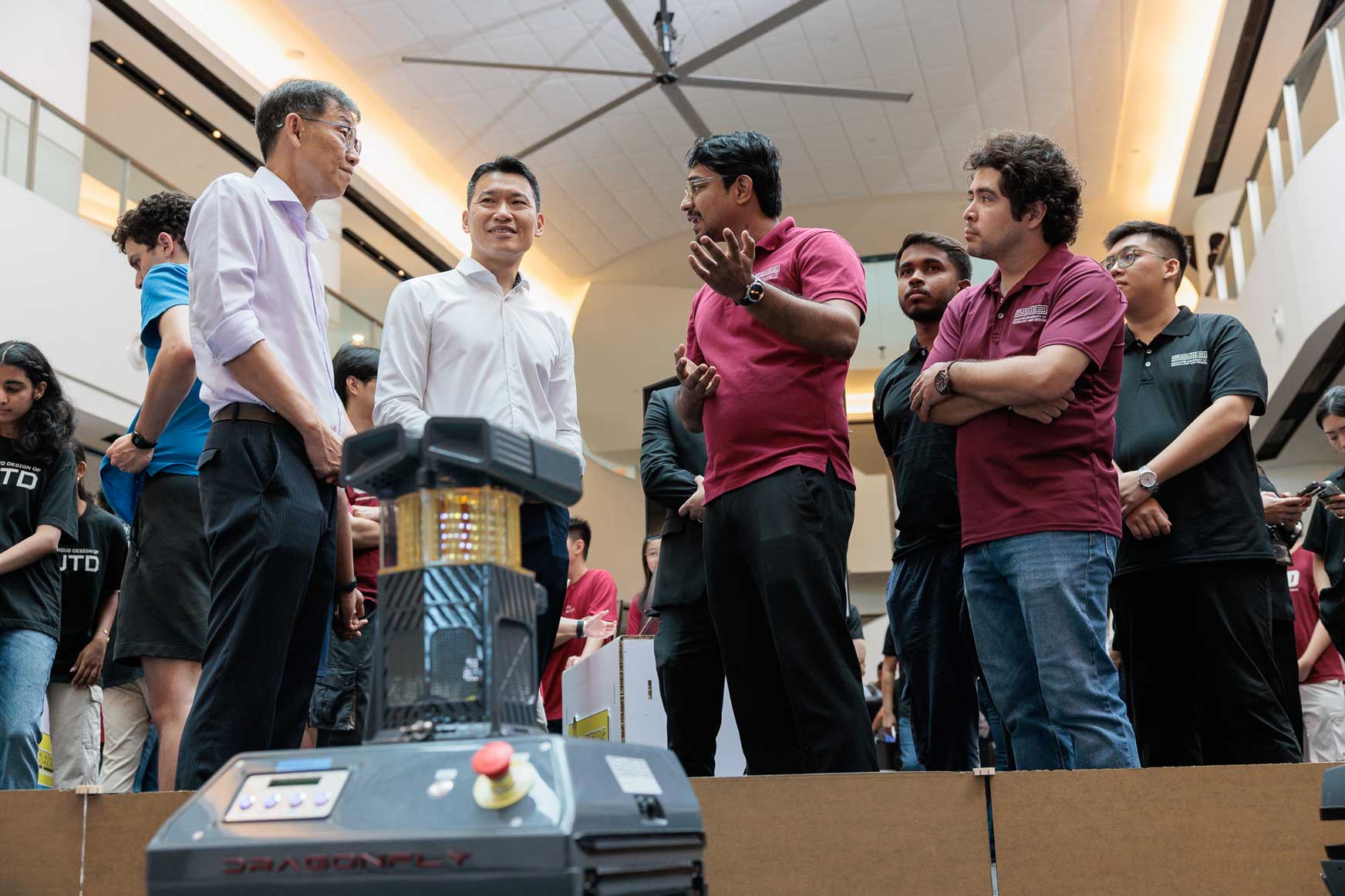 Acting Minister for Culture, Community and Youth and Senior Minister of State for Education, Mr David Neo, and SUTD President, Professor Phoon Kok Kwang, interacting with SUTD researchers demonstrating robots leveraging Physical AI.