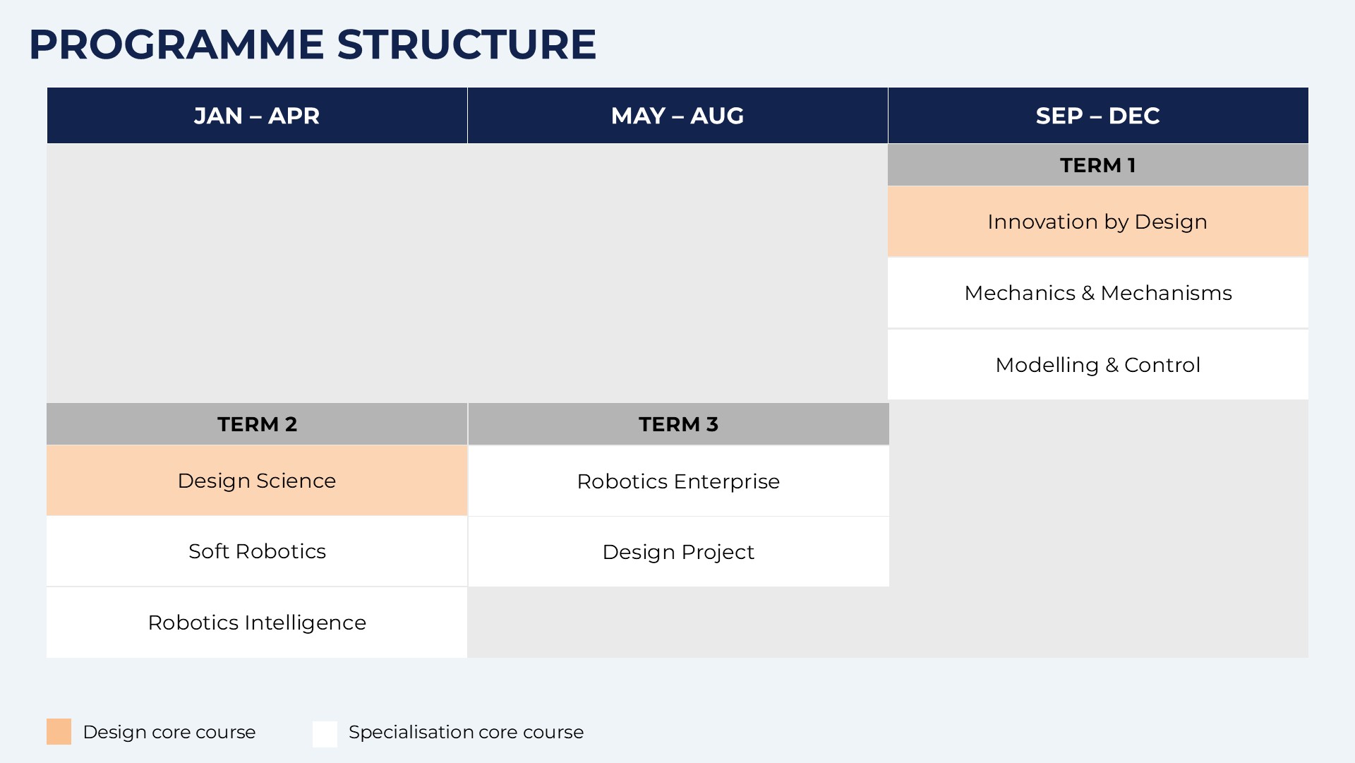 The MTD (Robotics & Automation) is a one-year full-time coursework-based Master programme. It comprises eight courses (96 credits)—two core design courses, five specialised courses, and one design project.