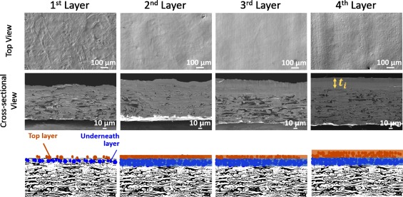 The SEM images of the top view and cross-sectional view of the printed structures when different numbers of layers are finished (i.e., printed and sintered) in the proposed optimized sintering sequence.
