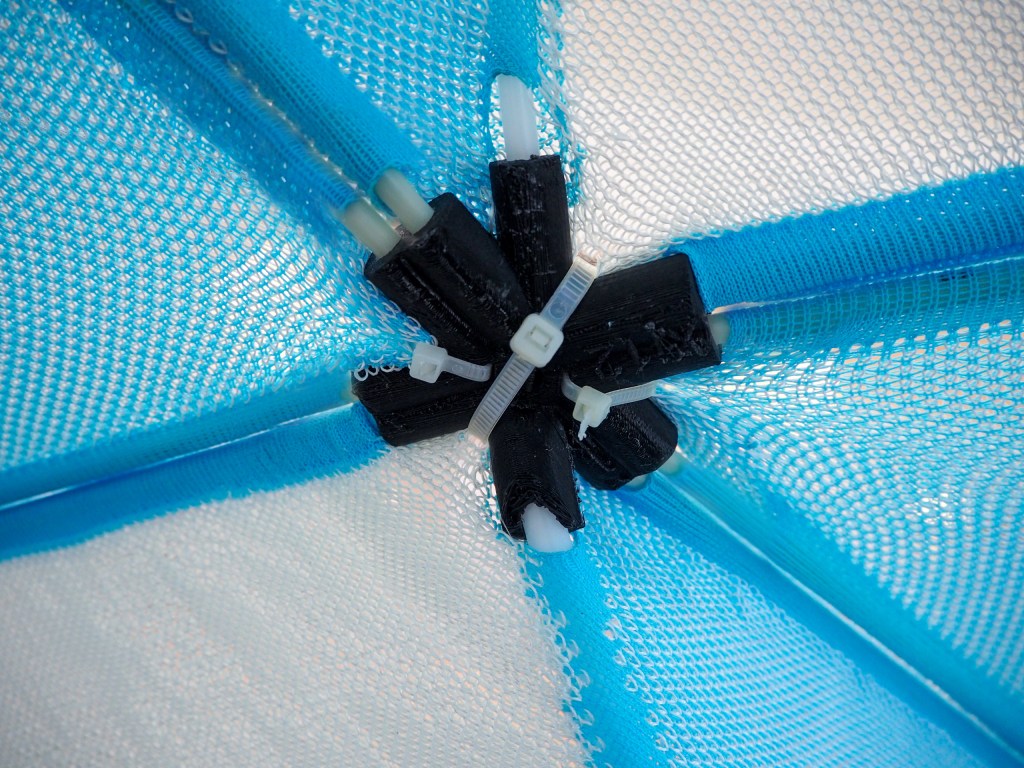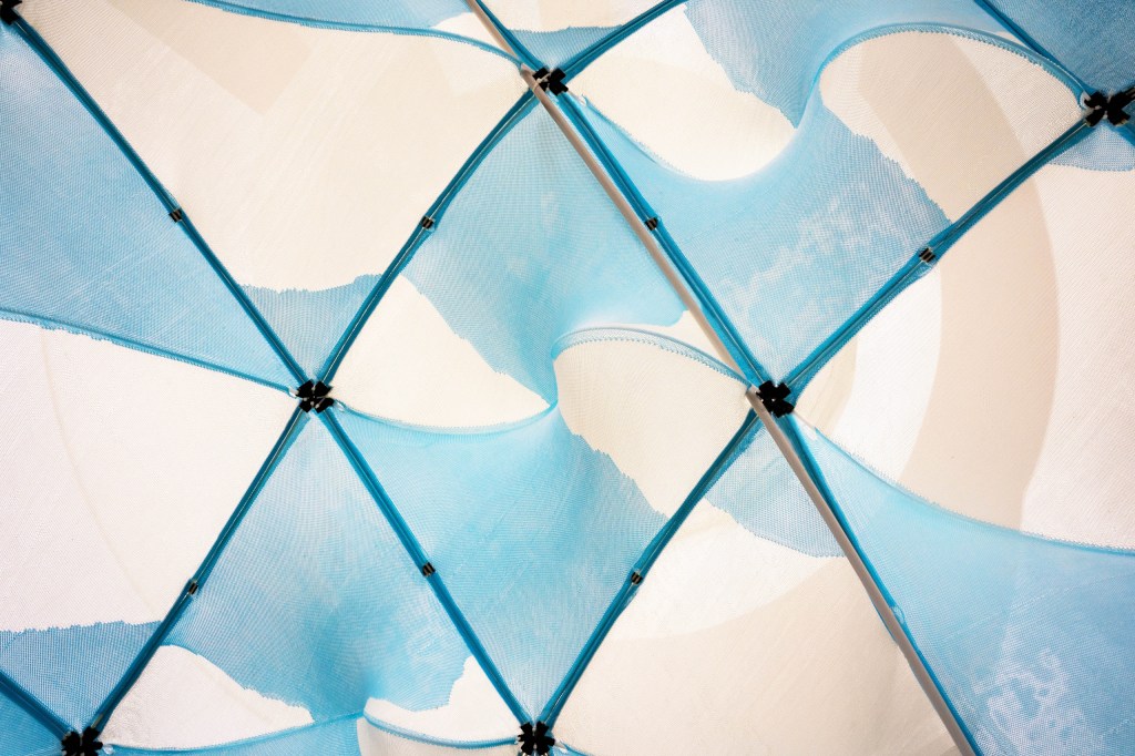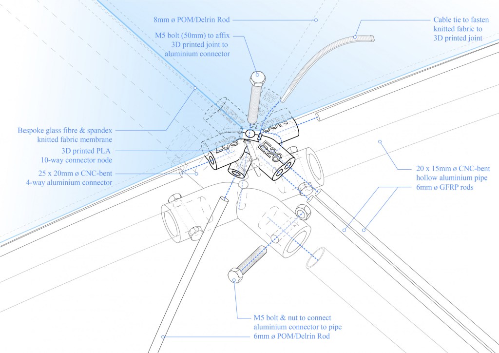 The pavilion’s skin is the cumulation of Ying Yi’s PhD research (‘Graded Knit Skins’) which explores the computational design and manufacture of multi-material machine-knitted textiles. The research capitalizes on the principles of computer numerical control (CNC) knitting to create differentiated patterned membranes out of glass fiber and spandex yarns to confer localized regions of varied elasticities within each piece of textile. These textiles interact with flexible Delrin rods inserted diagonally into its surface which bend and create the freeform interior. This assemblage of 35 uniquely shaped doubly curved panels is mounted on a bent thin aluminum pipe frame using 3D printed joints that interface with glass fiber reinforced polymer (GFRP) rods.