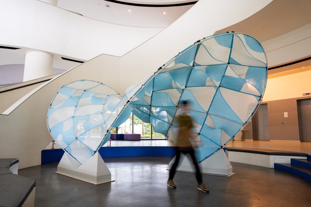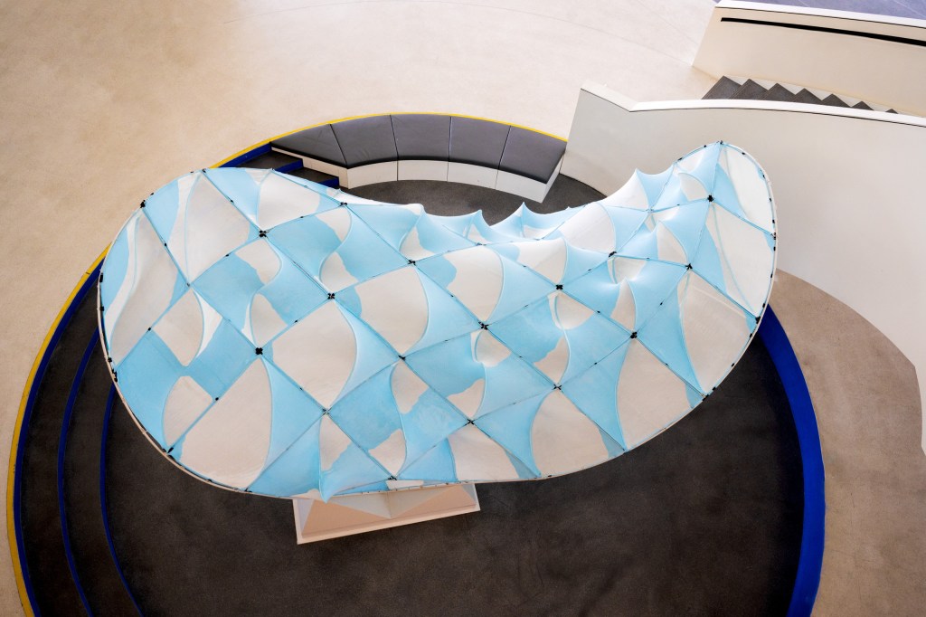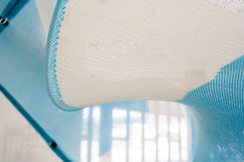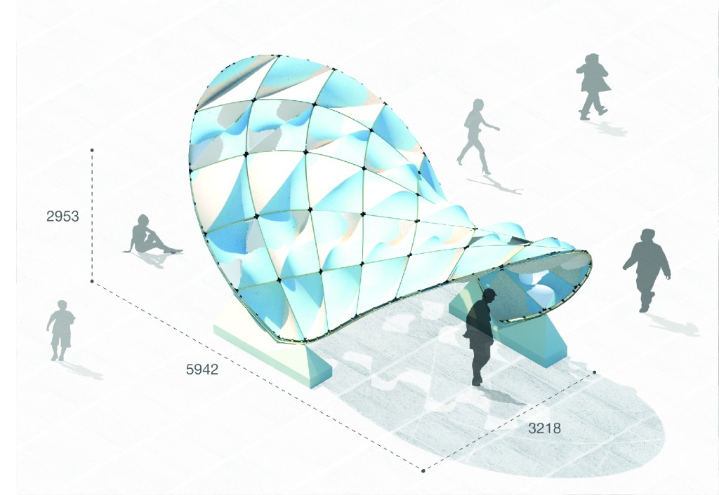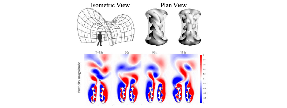 Knit Patterned Flow Pavilion is a spatial envelope formed by discrete knitted panels that seeks to amplify Singapore’s faint breezes to improve its interior and exterior thermal comfort. Its global and localized forms are informed by computational fluid dynamics (CFD): its parabolic hyperboloid global geometry funnels wind through its interior, while its localized scallop-shaped panels create textured undulations that deflect and hasten wind flows.
