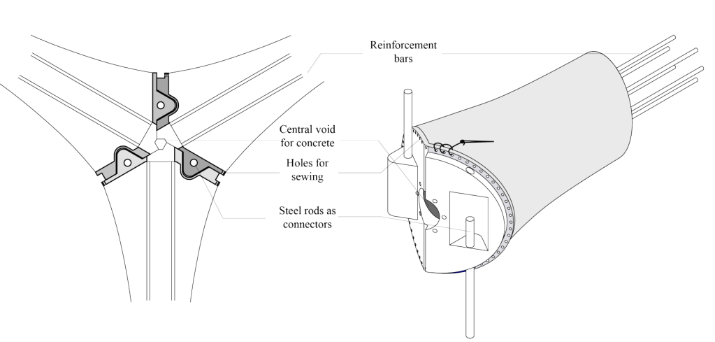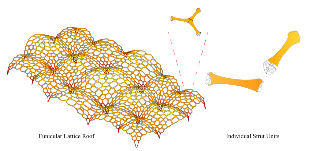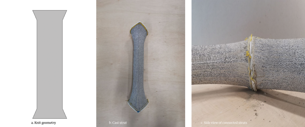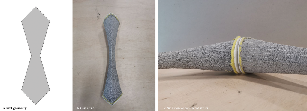 The manufacture of concrete funicular shells often relies on traditional formwork construction techniques to provide a sculptured cavity for the fluid material to occupy. While this enables a predictable geometric outcome, the extensive use of timber and/or steel to construct these formworks account for up to 60% of the total production cost of concrete and are discarded after the casting is complete. This research proposes an alternative method to create prefabricated modular systems out of concrete casted in customised tubular knitted membranes. These perform as a network of struts that can be affixed onto 3D printed nodes of a singular design. Altogether, these components serve as a kit-of-parts that can be transported to site and assembled together to create shell geometries.