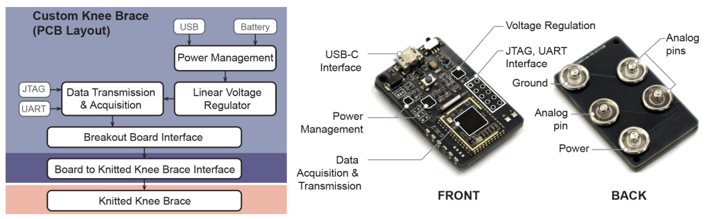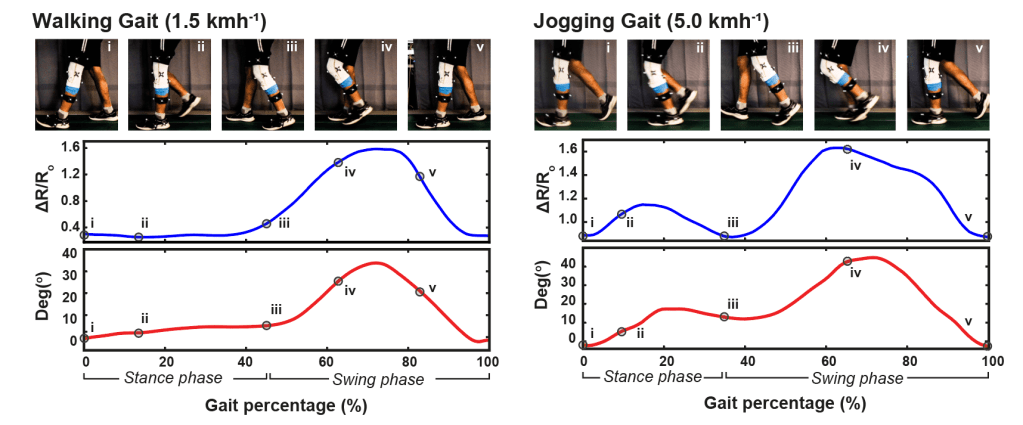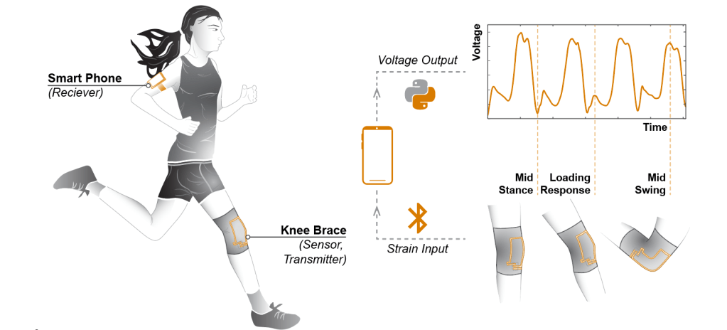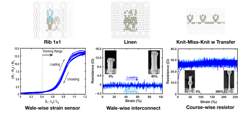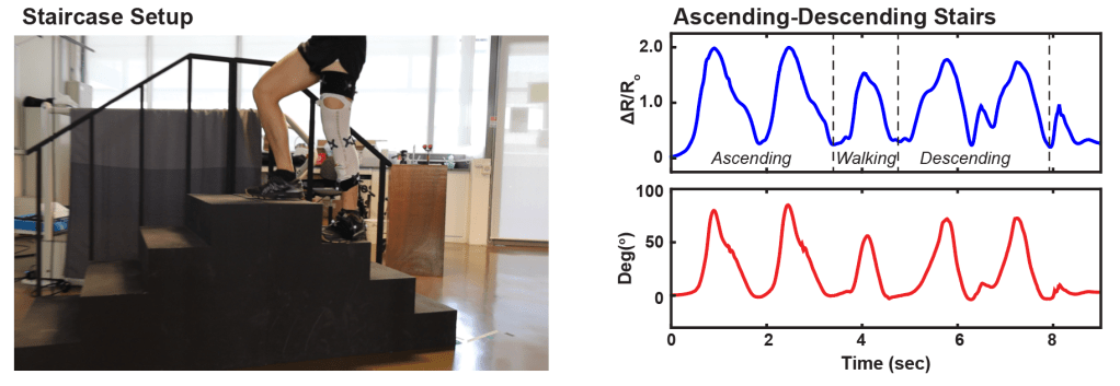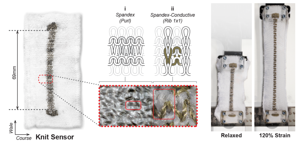 To demonstrate a potential application of this technology, a fully knitted smart knee brace for long-term unsupervised monitoring of lower-limb activities was developed. The flexible strain sensor, interconnects, and resistor were knitted as a potential divider circuit. The strain sensor signal responds to the flexing of the knee joint, and a comparison with motion capture data shows good correlation between the knitted strain sensor signal and the motion capture data. The technology can potentially be applied in the medicine, sports, and occupational health fields.