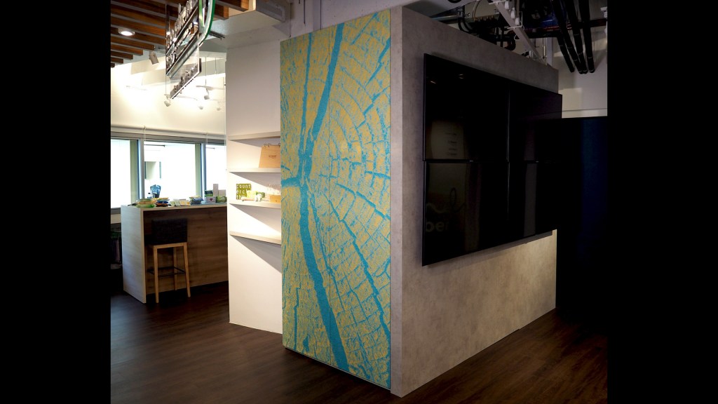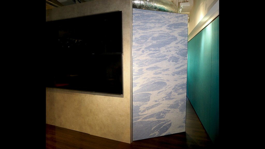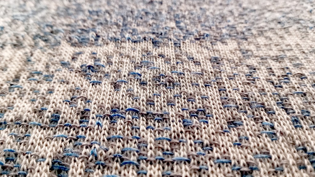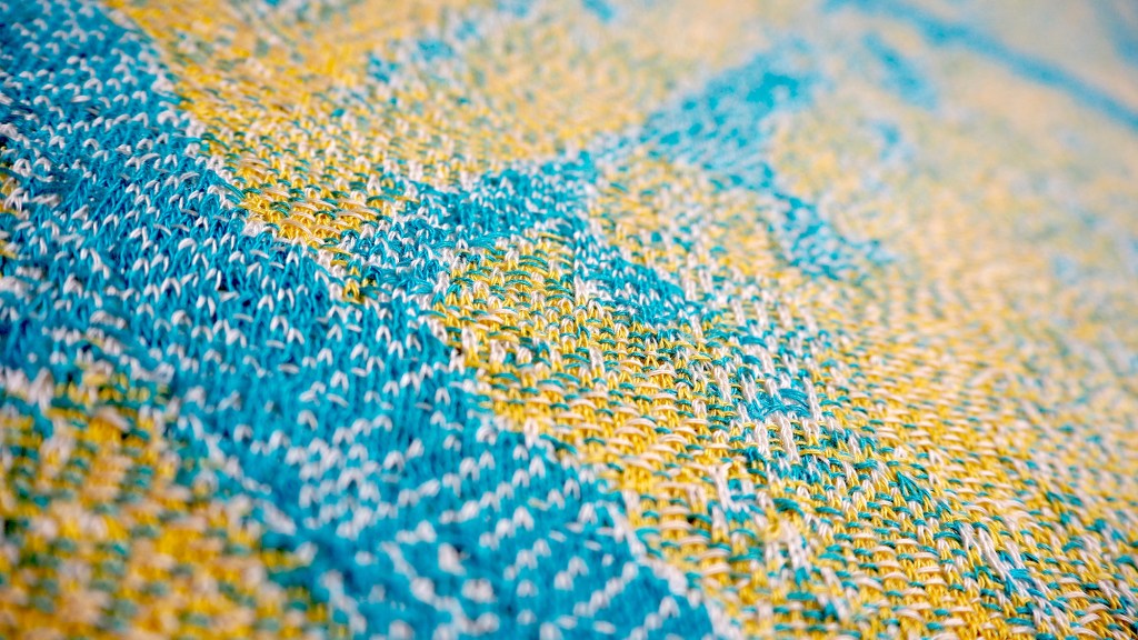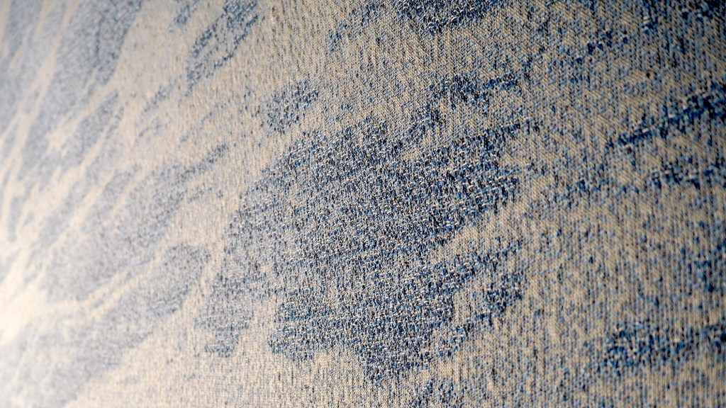 These knitted floor-to-ceiling panels demonstrate the vividly textured image-making capabilities of CNC knitting. Inspired by the collaborators’ commitment to environmental sustainability, the knitted panels use discrete white, grey, yellow, blue, and blue-green yarns to construct full-colour images of waves and tree rings. The panels are knitted using an algorithm developed under the Functional Textiles project. This process allows the controlled placement of colors on a stitch-by-stitch basis, creating the illusion of a continuous, wide range of colors. When seen from a distance, viewers perceive a cohesive image but up close, the knit structure and individually dyed yarns can be discerned.
