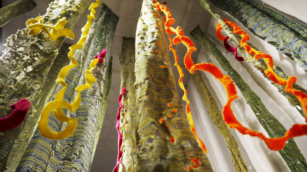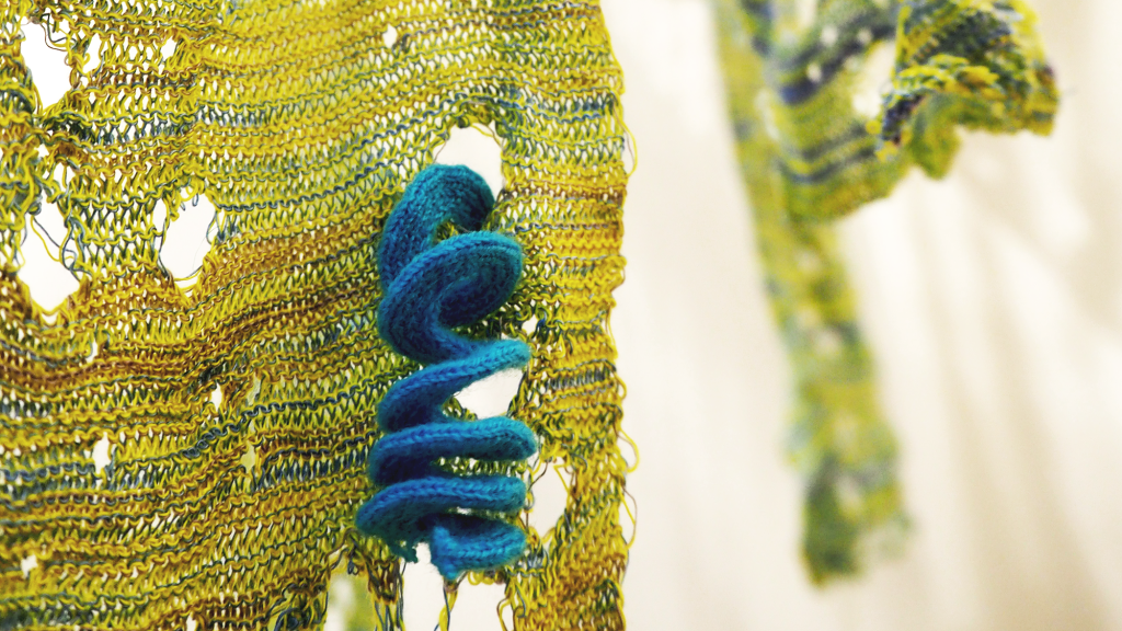 The multi-layered photograph and the variable spirals are knitted using algorithms that carefully control the placement of the knitted loops to create morphing geometries and perspective tricks, while the vegetation is knitted using an algorithm that randomly introduces defects that the knitting machine tries to self-correct.