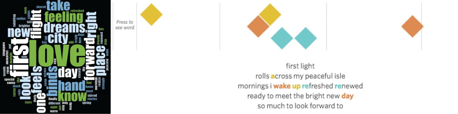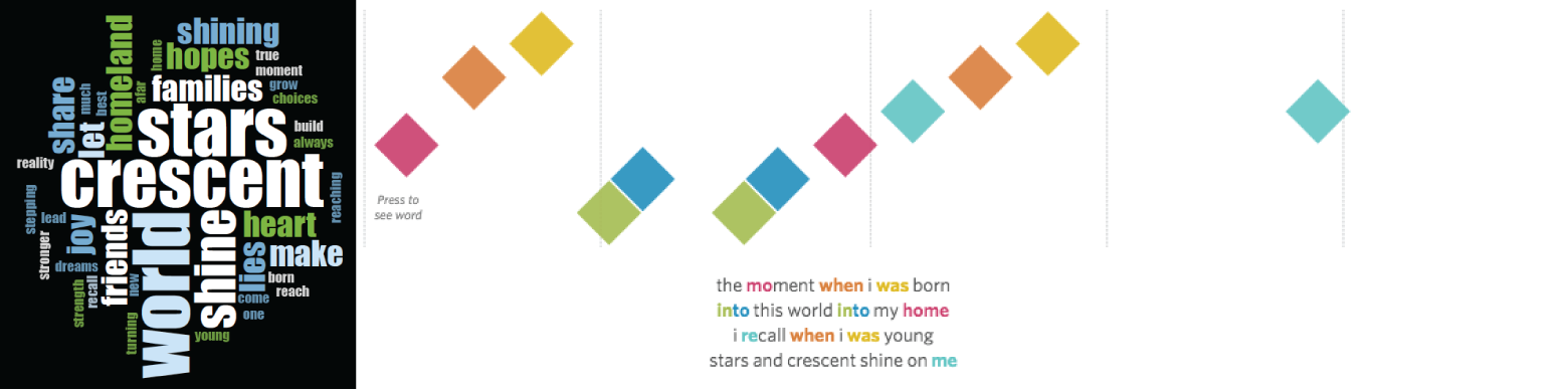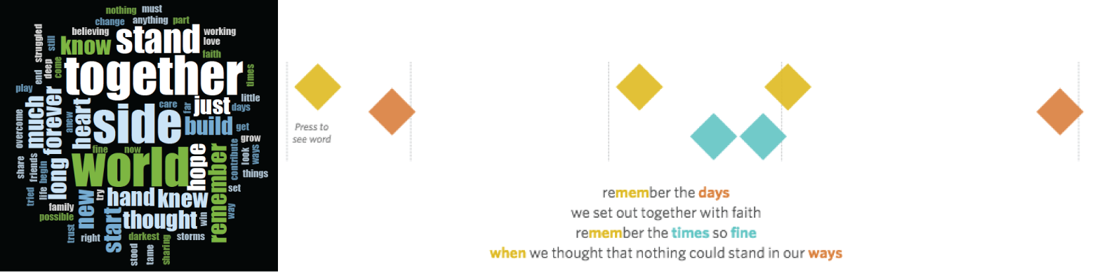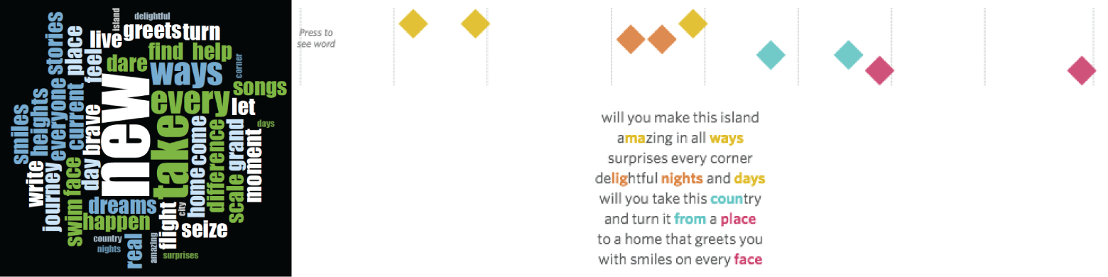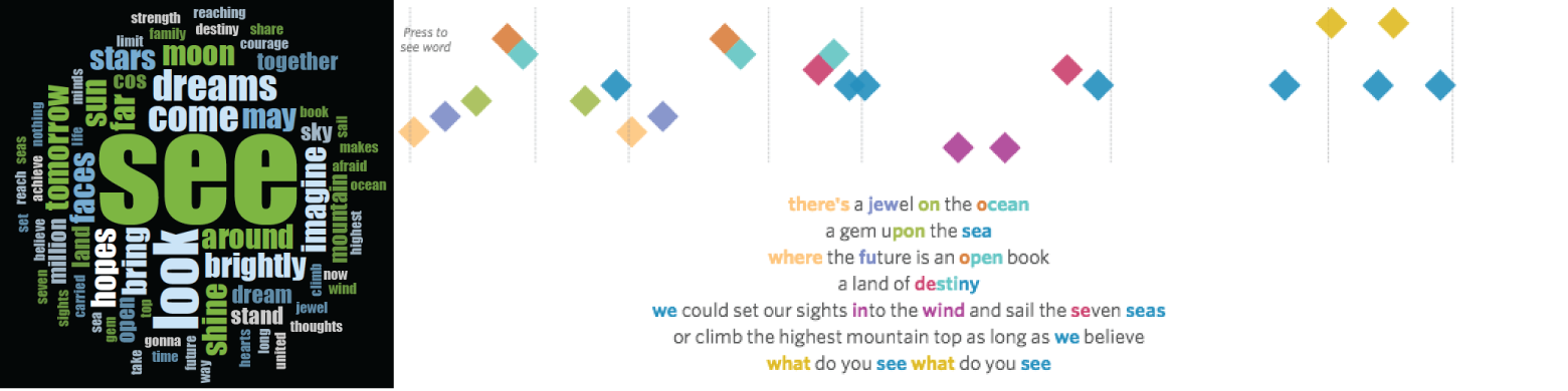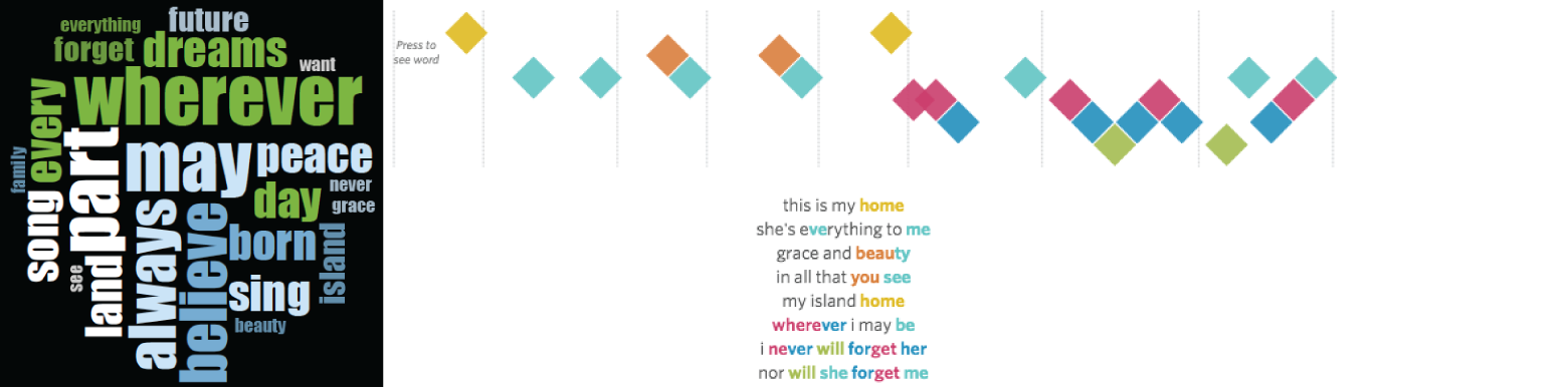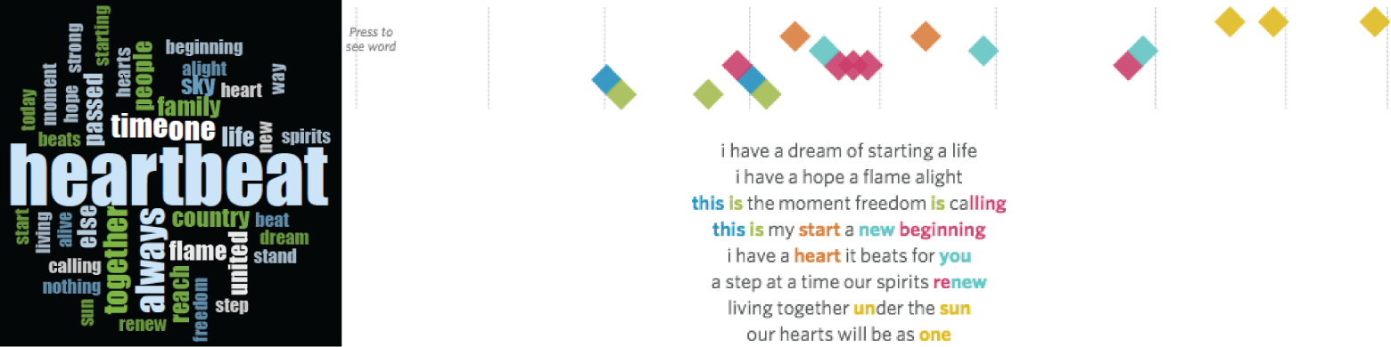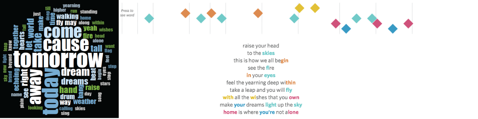 - Word composition. For each song, we analysed the words that were in the songs and present this in a word cloud. The more frequently a word appeared in the song, the larger the word appears in the graphic.
