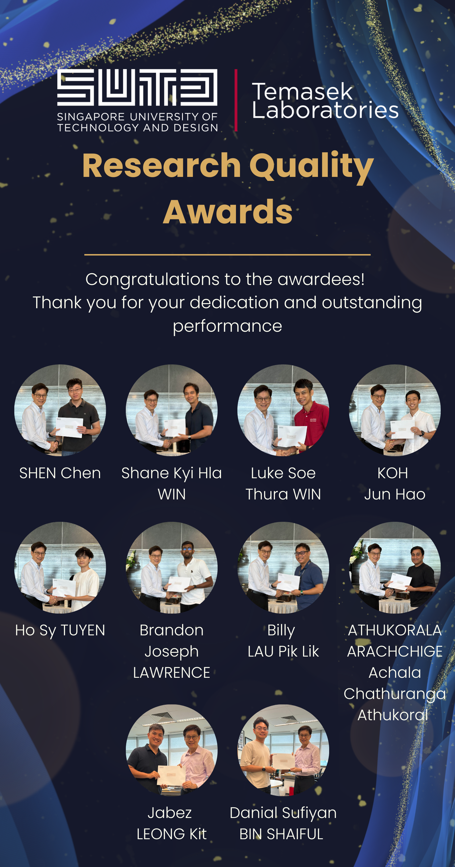 We are thrilled to announce the awardees of the TL@SUTD Research Quality Award. This prestigious award is presented to the top 30% performing researchers working in TL Core area (Robotics) for FY2023.