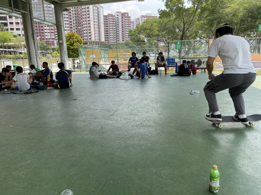 Users of Buangkok Sports Park sitting on the floor under the sheltered pavilion