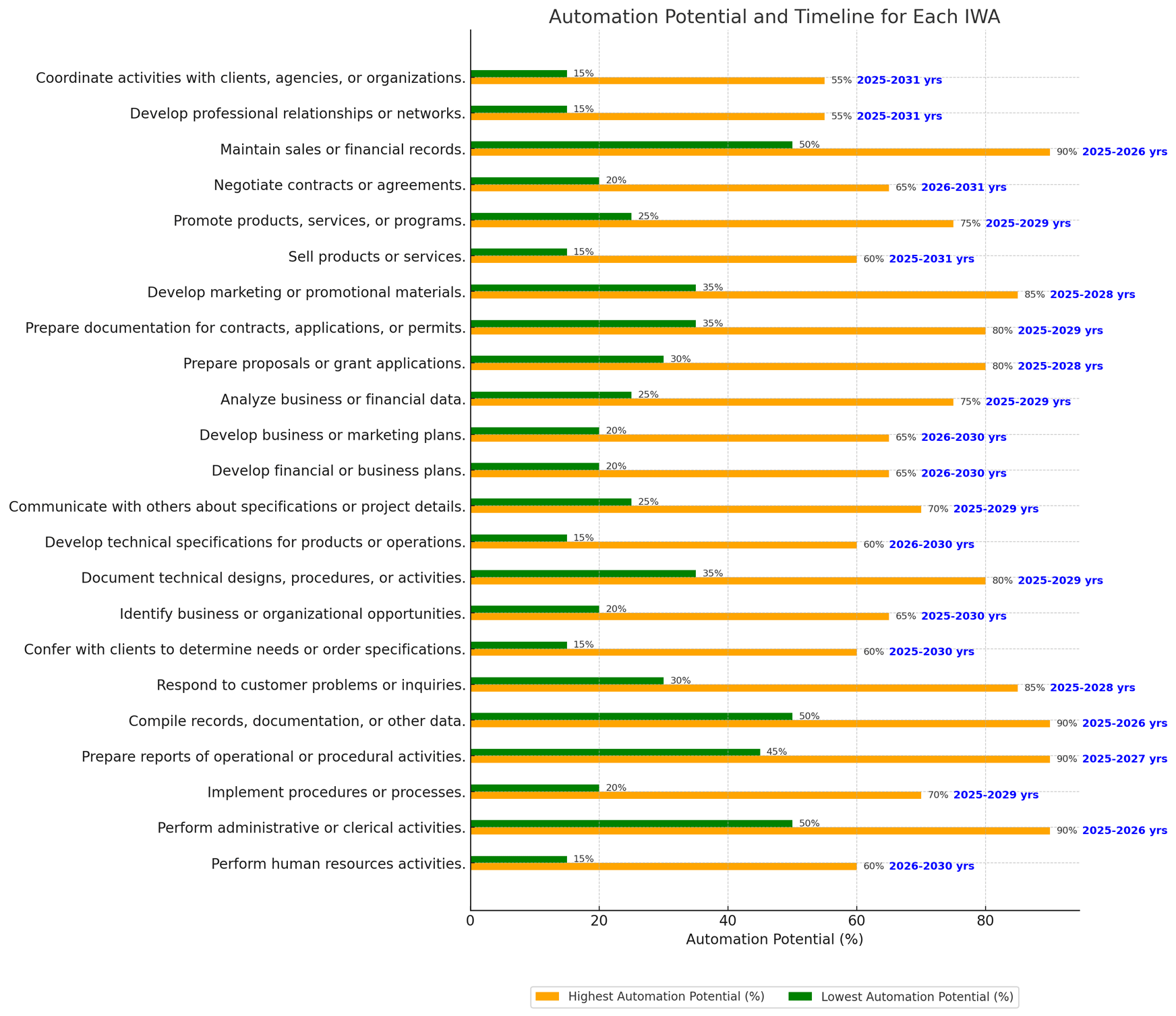Figure 1 shows the expected automation impact on various responsibilities of a Sales Manager. While strategic activities like negotiating contracts and developing business plans show moderate disruption potential (65–70%), more administrative and transactional tasks such as maintaining financial records or preparing documentation could be automated by up to 90%, some as early as 2025–2026. Overall, activities that rely on structured data and standardised processes are most at risk in the near term.