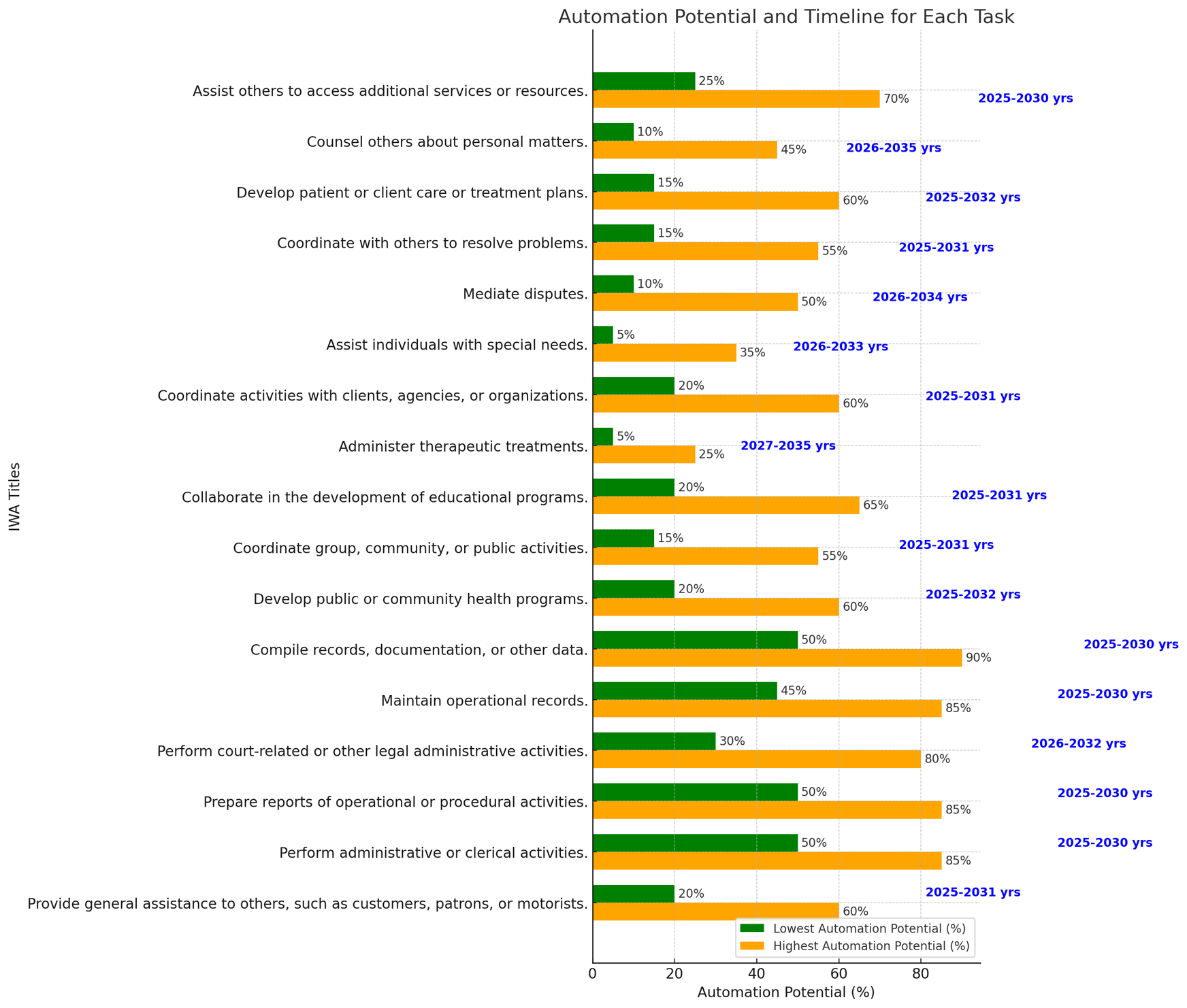 Figure 1 explores how different responsibilities of Social Workers may be impacted by automation. While deeply interpersonal tasks like counseling, mediating disputes, or assisting individuals with special needs show low disruption potential (only 35–50% at most), more administrative and data-handling duties such as compiling records, maintaining operational logs, and preparing reports are projected to be up to 85–90% automatable, with changes likely to begin between 2025 and 2032. This highlights a trend where AI is less likely to replace emotional labour but will significantly affect documentation-heavy aspects of the job.