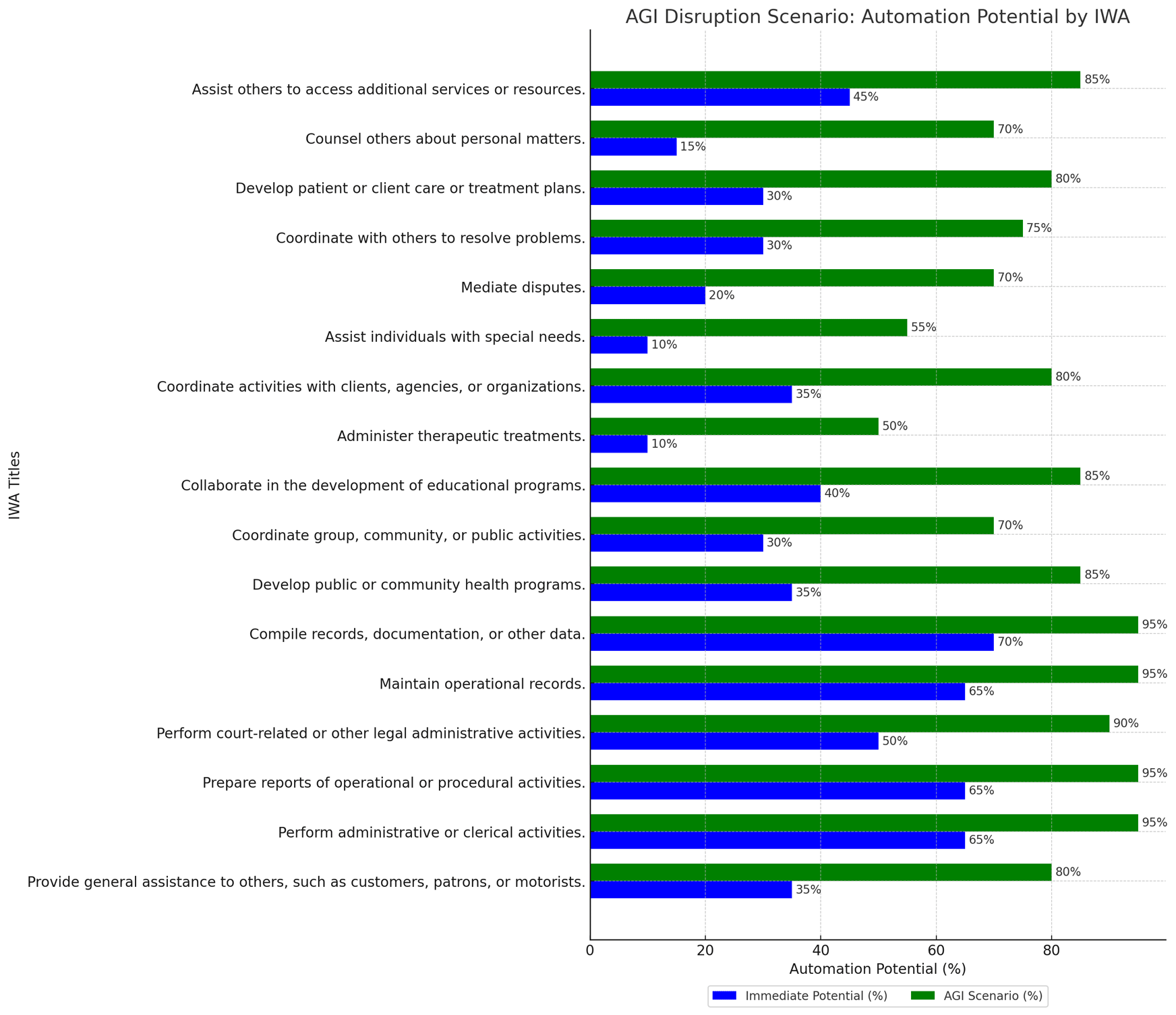 Figure 2 compares current automation capabilities with those projected in an Artificial General Intelligence (AGI) scenario. Even today, administrative and reporting tasks show immediate automation potential of 65–70%, which jumps to 95% or more under AGI conditions. However, core human-facing tasks like counseling and coordinating with others to resolve problems remain relatively protected even under AGI, due to the complex social, ethical, and emotional intelligence required.