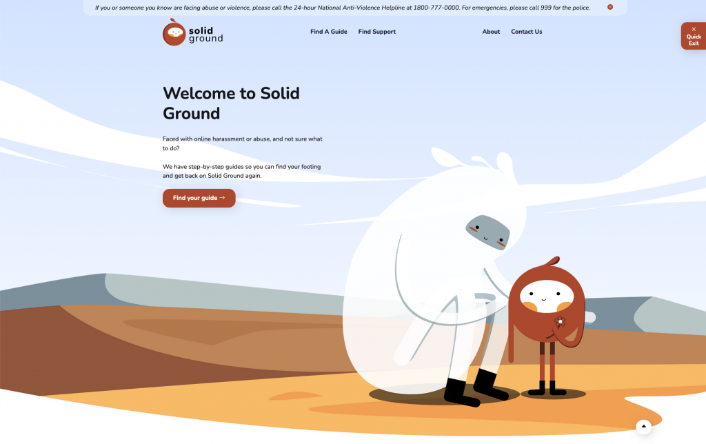 Solid Ground meets this need. The name Solid Ground reflects our desire for the site to be a place where individuals facing online harassment and abuse can catch their breath, find their footing, and orientate themselves before taking their next steps.