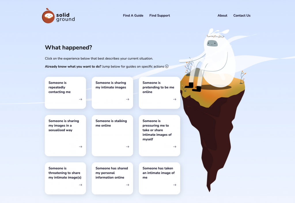 Solid Ground aims to be both comprehensive and concise, so that users are able to quickly see what actions they can take; and easily find the information they need to take their desired action. To achieve this, we structured the site around guides for nine common online experiences.