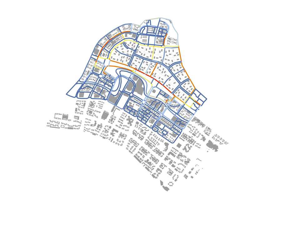 This animation simulates the early-stage evaluation process of the generative approach. The gradient colour represents the usage frequency (betweenness) of each candidate edge in the paths to reaching designated points of interest (POI). Redder edges indicate higher usage. This preliminary step will further guide the selection of pedestrian networks.